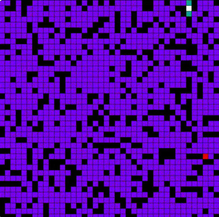 The animation below shows Djikstra’s algorithm being run on a random map to find the quickest path between two points. This GUI was written in Processing and allows the user to generate random maps and visualize different searching algorithms on these maps such as Breadth First Search, Depth First Search, or Priority Queue. You can download the code for yourself here.
